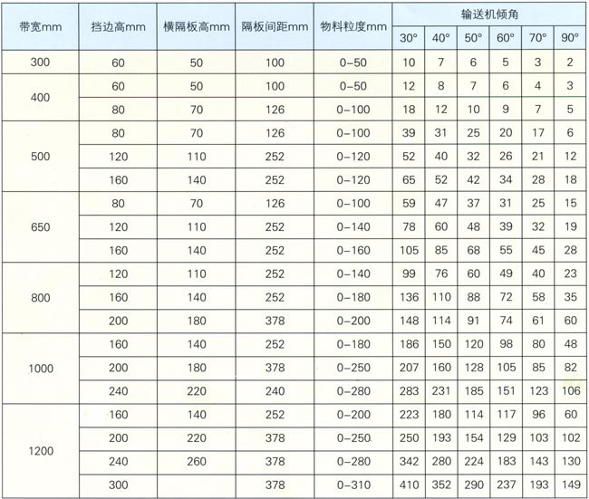 DJ型大大倾角波形挡边带式输送机能力(带速1m/s) (m3//h)